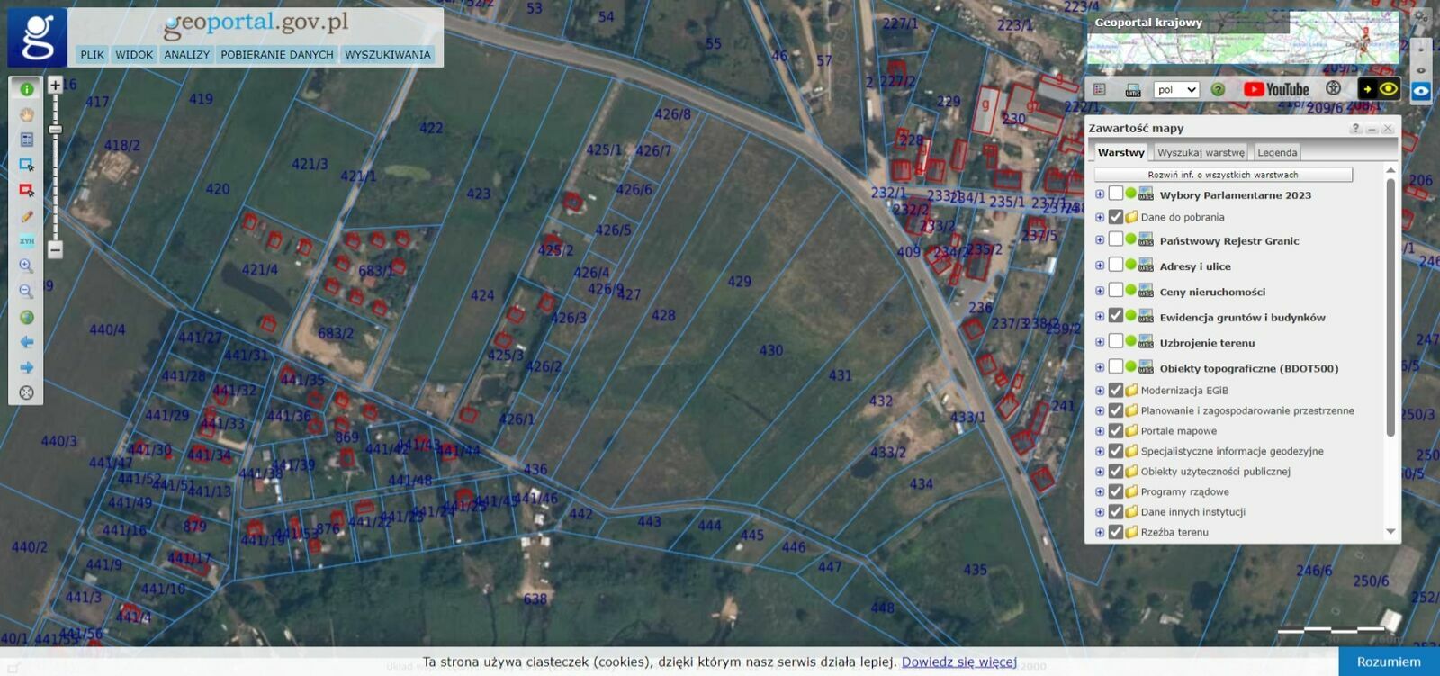 Wybrana działka: .426/1/2/3/4/5/6/7/8/9, droga wewnętrzna. Geoportal.gov.pl